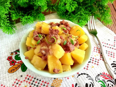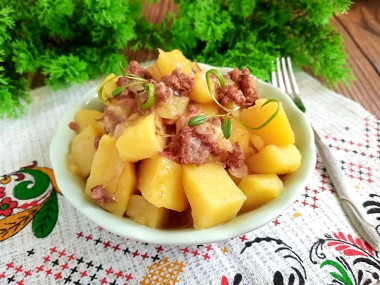 Жареная картошка с тушенкой на сковороде