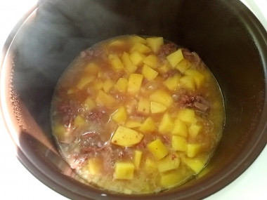 У меня была говяжья тушенка с большим количеством "желе". Решила, что на дно чаши выложу жир и лук, а сверху нарезанную картошку. Кстати картошку я предварительно хорошо промыла от крахмала. Последним слоем выложила тушенку, размятую вилкой. Воду не добавляла, т. к. жидкости было достаточно. Специи и лавровый лист уже были в самой тушенке, поэтому осталось только посолить. Готовила на программе "тушение" 40 минут.