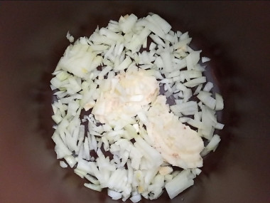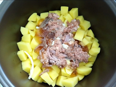 Выложите в чашу мультиварки сначала картофель - дно чаши ничем не смазываем.