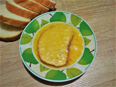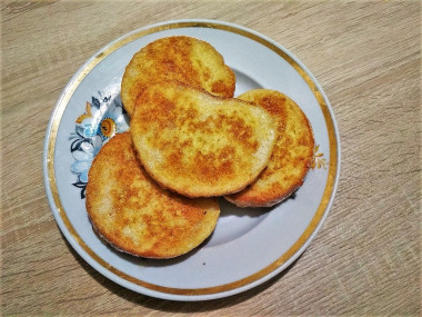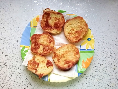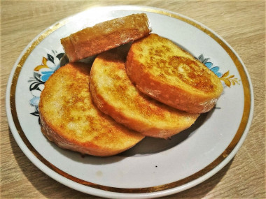 излишек хлеба, обычно сушу сухари. А в этот раз сделала жареный батон в яйце. От привычных гренок эта закуска отличается тем, что тут кусочки хлеба обмакиваются только во взбитое яйцо.