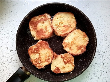 Затем переверните кусочки батона на другую сторону лопаткой и обжаривайте их также до румяности. Чтобы быть уверенным, что батон с яйцом прожарился хорошо, можно закрыть сковороду крышкой и подержать сковороду на огне еще пару минут.