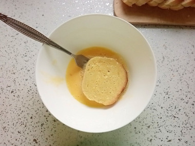 На сковороде разогрейте растительно масло. О том, как подобрать сковороду, а также как правильно выбрать масло, читайте в отдельных статьях, ссылки в конце рецепта. Выложите на сковороду кусочки батона, предварительно обмакнув их в яичную смесь. Долго в яичной смеси батон держать не нужно, чтобы он сильно не пропитался жидкостью, иначе он может не пропечься. Обжаривайте кусочки батона в яйце на среднем огне с одной стороны до образования румяной корочки