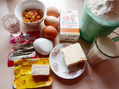 Калорийность продуктов: Растительное масло, Сливки, Пшеничная мука, Сахар, Сухие дрожжи, Яйца, Сливочное масло, Ванилин, Соль, Изюм, Смесь цукатов, Коньяк, Яичные белки, Сахарная пудра, Лимонный сок