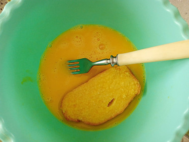 Каждый кусочек хлеба обмокните в яичную смесь, делать это нужно быстро, чтобы хлеб сильно не пропитался жидкостью внутри, иначе он сильно размокнет и может плохо прожариться. Достаточно погрузить кусочек хлеба на несколько секунд и перевернуть его, чтобы хлеб был в яичной смеси с обеих сторон.