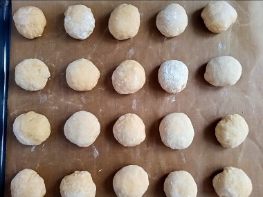 Сделайте из теста небольшие шарики. Раскатайте каждый шарик скалкой, придавая тесту форму круга толщиной около 1-2 сантиметров. Проколите каждую заготовку вилкой в нескольких местах, чтобы пышки не трескались при выпечке.