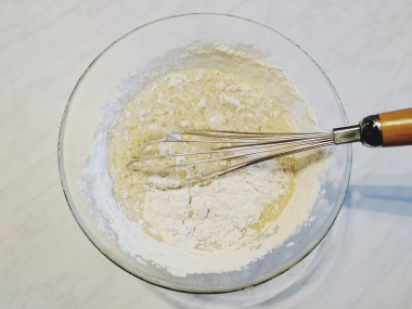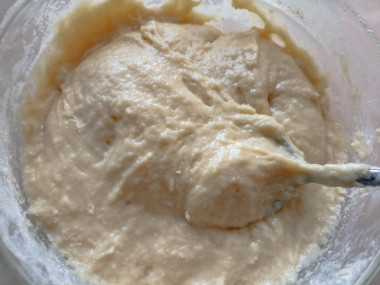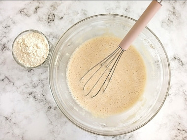 Частями введите в тесто просеянную муку, каждый раз хорошо вмешивая её в жидкие ингредиенты. В зависимости от качества муки её может понадобиться чуть больше или чуть меньше. О муке и её свойствах подробнее можно прочитать в отдельной статье, ссылка в конце рецепта.