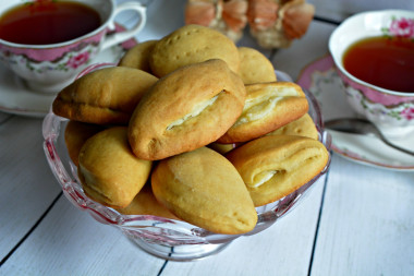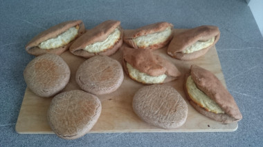 Можно добавить начинку — попробуйте вариант с творогом. Это напомнит вам советские школьные сочники. Смешайте творог с сахаром и ванилином. Раскатайте тесто чуть тоньше, чем для простых пышек. На половину каждой заготовки положите немного творога, прикройте другой половиной.