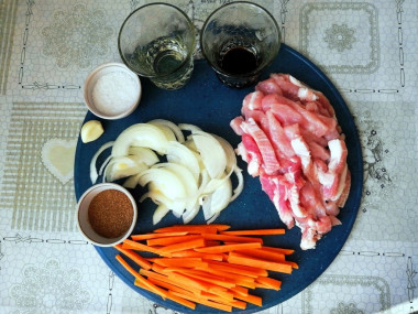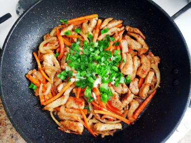 Из всего необходимого для готовки у меня не нашлось болгарского и стручкового перцев. Зелень заменила на замороженный зеленый лук. Нарезала мясо, лук и морковь, обжарила все последовательно. К мясу добавила соевый соус. Поскольку он достаточно соленый, соль в блюдо добавлять не стала. Из специй добавила готовую приправу для мяса и красный молотый перец. Последними отправила в сковороду порубленный чеснок и зеленый лук.