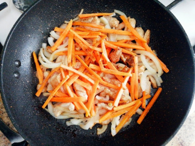 Добавьте нарезанный лук, потом морковь, перемешайте, жарьте 3 мнуты.