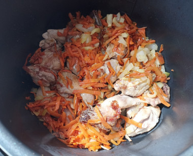 Выложите к курице морковь и лук, перемешайте и готовьте на режиме еще 10 минут также при помешивании до сигнала об окончании этого этапа процесса.