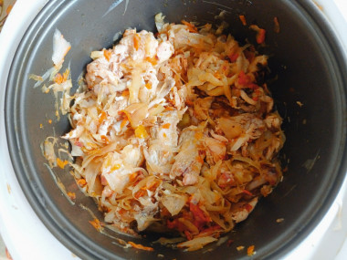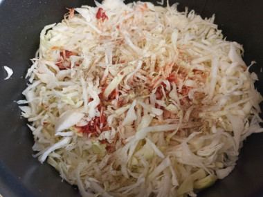 Добавьте капусту и все хорошо перемешайте. Включите режим "Тушение" на 20 минут.