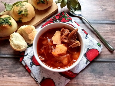 В рецепте используется курица, но у меня была хорошая, свежая говяжья косточка. Сварила бульон из нее, а мясо обрезала и выложила в суп. Бульон варила часа два, поэтому начала приготовление с утра, чтобы к обеду успеть. Картошку нарезала крупными кусочками. Лук и морковь измельчила привычным способом: лук кубиками, а морковь натерла на крупной тёрке. Обжарила до прозрачности лука. Морковка за это время отдала свой цвет маслу и бульон получился золотистого цвета. Правда потом его окрасили томат и свекла в красный). Капуста у меня жесткая, выложила ее в кастрюлю вместе с картошкой. От себя добавила по ложечки сахара и лимонного сока для вкуса и цвета. Пампушки делать легко! После активации дрожжей замесила тесто, дала ему подойти и разделила на 8 частей. Смазала комочки теста растительным маслом и выпекала до румяного цвета. Чеснок растерла с укропом и этой ароматной смесью смазала горячие пампушки. Наваристый борщ с мягкими, слегка островатыми пампушками - это просто чудесный обед в кругу семьи!
