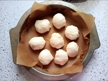 Разделите тесто на небольшие кусочки, скатайте из них шарики по размеру чуть больше грецкого ореха. Шарики из теста выложите в форму, смазанную сливочным маслом, оставляя между ними небольшое расстояние. Пампушки сверху можно смазать растительным маслом по желанию. Оставьте в теплом месте, пока духовка разогревается до 180 градусов.