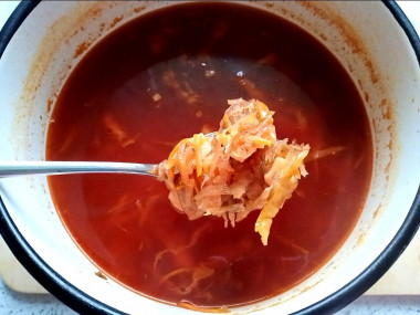 Выложите в бульон свеклу, белокочанную капусту и зажарку из моркови и репчатого лука. Добавьте пару столовых ложек томатной пасты и специи: соль и черный молотый перец по вкусу. Варите борщ на среднем огне в течение 25 минут.