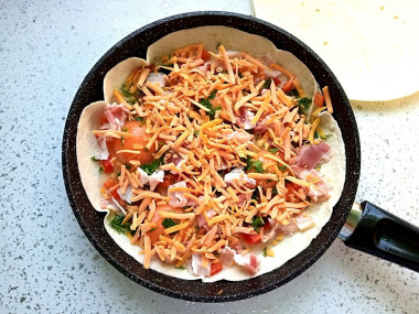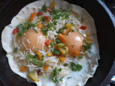 У меня не было обычного тонкого лаваша, но были лепешки тортилья. Толщина слегка отличается, но суть та же. Одну лепешку оставила как есть, а вторую обрезала. На лепешку разбила яйца и присолила их. Сверху посыпала кубиками сладкого болгарского перца. Из зелени взяла петрушку и укроп, мне нравится их аромат. Кроме сыра решила добавить бекон. У меня в морозилке были тонкие пластинки, которые предварительно разморозила и нарезала. Готовила завтрак на маленьком огне до расплавления сыра, потом перевернула лепешку. К этому фокусу надо приноровиться). Легче всего сделать это при помощи большой крышки. Желательно по диаметру сковороды, чтобы не обжечься горячим маслом и соком овощей.