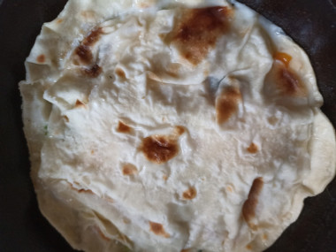 Приготовила завтрак из лаваша на сковороде с начинкой из яиц и сыра по этому рецепту. Нам очень понравилось! Идея "спрятать" между лепешек яйца и другую начинку оригинальна и достойна внимания!