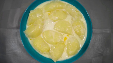 В кастрюлю налейте воду и поставьте ее на сильный огонь. Как только вода закипит, посолите ее и аккуратно выложите в неё вареники. Перемешайте, чтобы они не слиплись между собой. Снова доведите воду до кипения. Как только вареники всплывут на поверхность, варите их еще 3-4 минут на среднем огне.