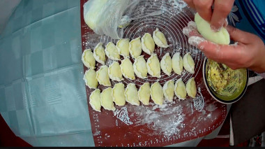 Возьмите "отдохнувшее" тесто и раскатайте его при помощи скалки с тонкий пласт. Стаканом или чашкой вырежьте из теста кружочки. В середину этих кружочков положите творожную начинку, после чего плотно защипите края вареников. Таким же образом сформируйте все оставшиеся вареники.