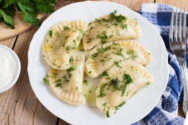 Готовые вареники выловите при помощи шумовки из кастрюли в большое блюдо и смажьте сливочным маслом. Подавать можно со сметаной и зеленью. Приятного аппетита!