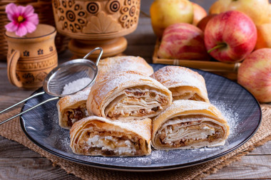 Быстро и легко и к тому же очень вкусно! Лаваш с яблоком и творогом в духовке - чрезвычайно простое в приготовлении и довольно быстрое блюдо для уютных семейных посиделок. Поскольку тесто замешивать не нужно, то и справится с этой простой выпечкой практически любой. Тонкий лаваш можно купить в любом хлебном отделе. Тертые сочные яблоки идеально сочетаются с творогом и рулет получается очень вкусным и красивым в разрезе.