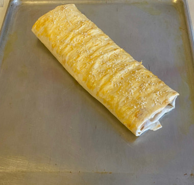 Переложите рулет швом вниз на противень, застеленный бумагой для выпечки. Яйцо вбейте в небольшую мисочку, взбейте его вилкой до смешивания белка и желтка. Смажьте рулет взбитым яйцом при помощи кулинарной кисти. Запекайте лаваш с начинкой в духовке, предварительно разогретой до температуры 180°С, 20-25 минут, в зависимости от особенностей вашей духовки. Ориентируйтесь на цвет лаваша — он должен зазолотиться.