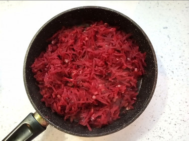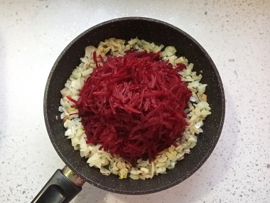 Сразу поставила сковороду разогреваться. Очистила лук, нарезала кубиками и отправила жариться. Тем временем взяла большую свеклу, очистила и натерла на крупной тёрке. Если бы было время, то воспользовалась бы корейской тёркой для красоты. Добавила свеклу к луку и жарила дальше помешивая на среднем огне. Именно жареная, а не тушеная свекла получается особенно вкусной. Она как будто слегка карамелизуется.