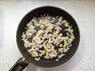 На сковороду налейте растительное рафинированное масло и хорошо его прогрейте. Сделайте средний огонь и обжарьте лук 3 минуты при помешивании до прозрачности. Следите за тем, чтобы лук не пригорел и не стал коричневым. Нужно, чтобы он просто немного притомился.