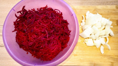 Как пожарить свеклу с луком? Подготовьте продукты. Свеклу вымойте и обсушите. Очистите ее и натрите на крупной терке. Лук очистите от шелухи, промойте, обсушите и мелко нарежьте. Свеклу для рецепта используйте сочную и сладкую. Лук можете брать белый, фиолетовый или такой и такой.