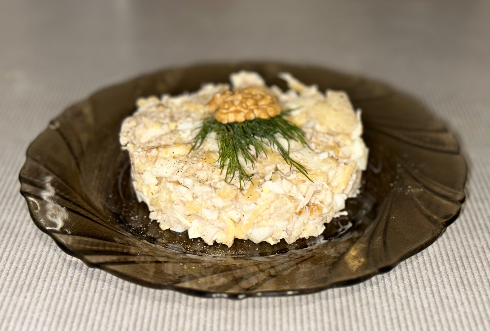 Этот салат – яркий пример кулинарного творчества постсоветского пространства. Он появился в 90-е годы, когда на прилавках стали доступны консервированные ананасы. Сочетание доступных продуктов (курица, яйца, сыр) с экзотическим фруктом мгновенно завоевало любовь и стало классикой праздничного стола.