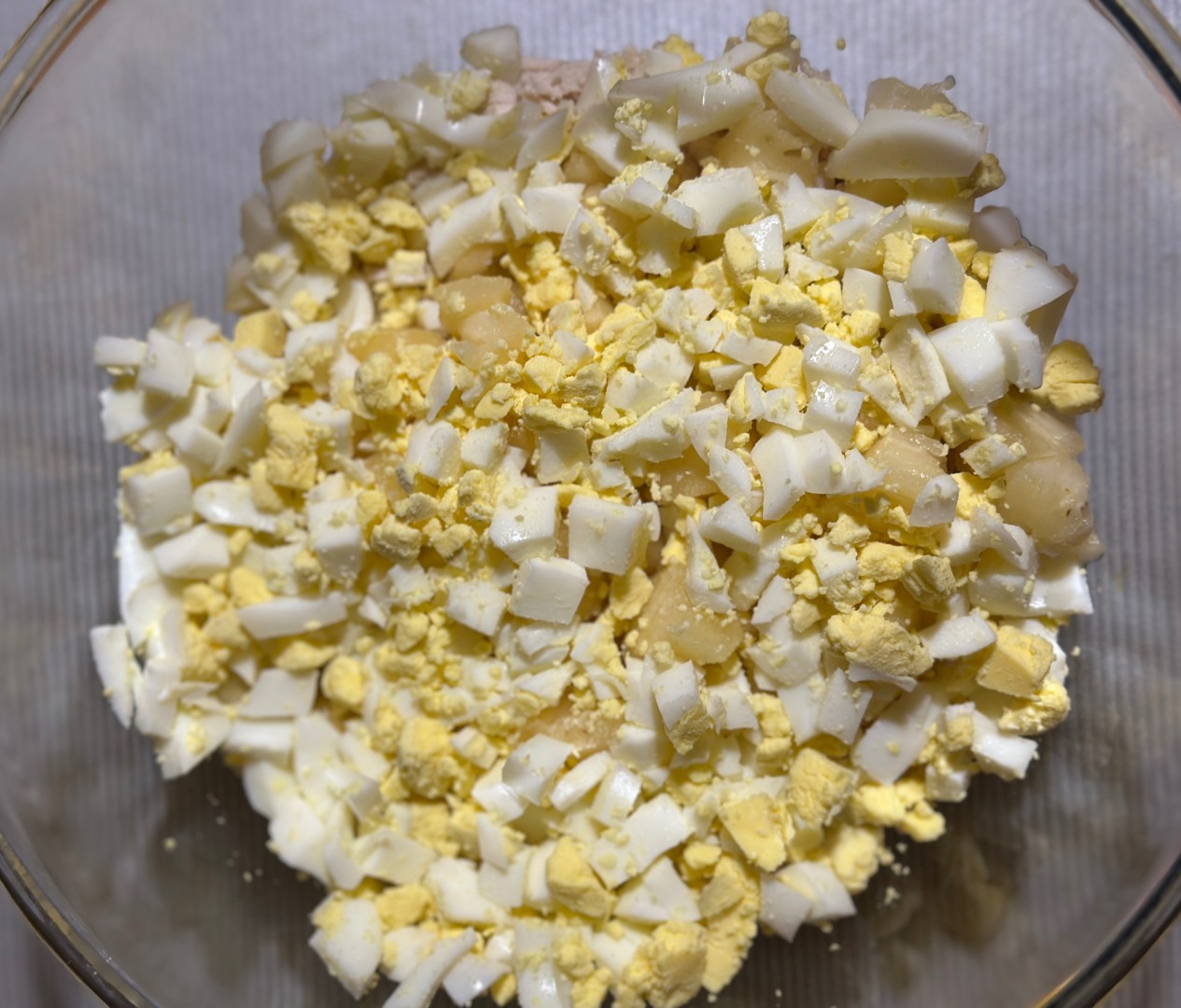 Отварные яйца натрите на крупной терке и выложите последним слоем салата. Снова плотно прижмите ложкой. Здесь майонез не понадобится. Затем извлеките салат из формы. А все тонкости выбора яиц и кастрюли для варки - в материалах по ссылкам в конце рецепта. По желанию можете посолить дополнительно любой слой.