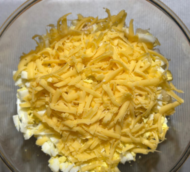 Твердый сыр натрите на мелкой терке. Выложите следующим слоем в кольцо. Поплотнее прижмите сыр при помощи ложки, чтобы слой майонеза при смазывании не повредил целостность слоя сыра и салат хорошо держал форму. Подробнее о том, как заменить виды сыра и работать с привычной теркой, читайте в материалах по ссылкам ниже. Этот слой салата также смажьте майонезом.Шаг 4. Как добавить яйца в салат?