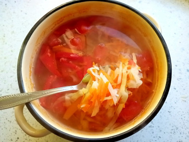 Белокочанную капусту очистите от верхних грязных листьев и тонко нашинкуйте ножом. Сложите в кастрюлю, подготовленную для супа.