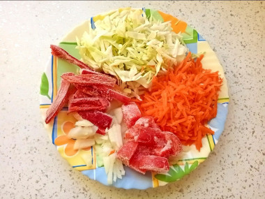 Морковь и лук очиститье, промойте, обсушите и мелко нарежьте. Способ нарезки зависит от ваших предпочтений, я лук нарезала полукольцами, а морковь - соломкой. Добавьте их к капусте в кастрюлю.