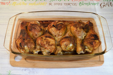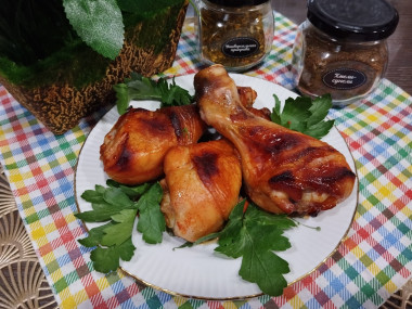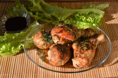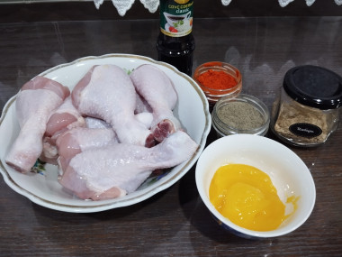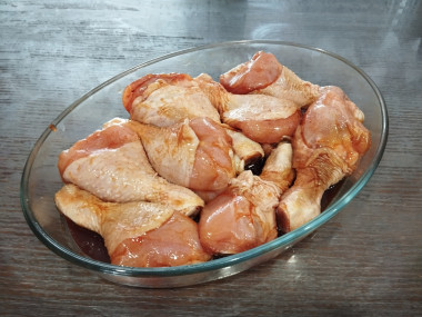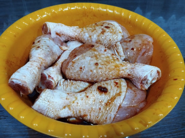 Куриные ножки помойте, обсушите, выложите в миску. Залейте ножки полученным соусом и помассируйте их, как бы втирая соус в мясо. Оставьте ножки мариноваться на 2-5 часов. Лучше оставить курицу в маринаде на ночь, поместив ее в холодильник. Тогда она лучше пропитается соусом. За время маринования переверните голени несколько раз, чтобы они равномерно пропитывались маринадом.