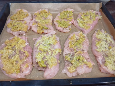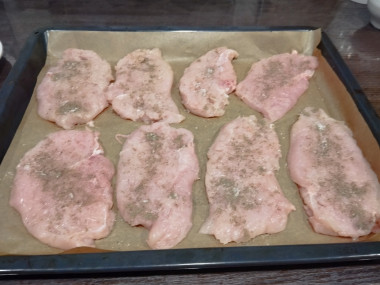 Противень застелить пергаментом для выпечки. Пергамент смазать растительным маслом, чтобы курица не пригорела и не прилипла. На противень разложить кусочки куриного филе поближе друг к другу.