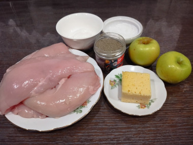 Подготовить ингредиенты. Для приготовления куриного филе с яблоками в духовке нам понадобится: крупное куриное филе, крупное сочное кисло-сладкое яблоко, сыр, майонез, растительное масло, черный молотый перец и соль.