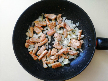 Убавьте огонь и жарьте, помешивая, около 20 минут. Мясо должно зарумяниться со всех сторон. Добавьте в сковороду лук и жарьте вместе с мясом около 5 минут.