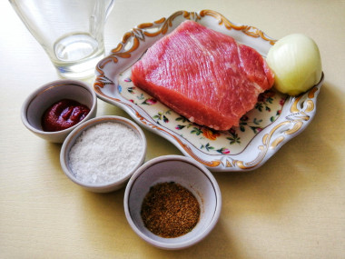 Как сделать поджарку из свинины на сковороде? Подготовьте ингредиенты. Для приготовления поджарки нам понадобится: мякоть свинины (у меня вырезка, можно взять готовое мясо для гуляша), луковица, томатная паста, кипяток, растительное масло, специи для свинины, соль.