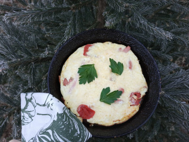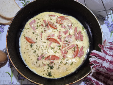 Сделала омлет на сковороде с колбасой и сыром на завтрак по этому рецепту. Варёную колбаску обжарила, добавила помидоры и ещё потомила немного на сковороде. Яйца взболтала с молоком, добавила соль и перец, а также тертый сыр. Залила этой массой колбаску с помидорами и готовила под крышкой минут 7 на медленном огне. Восхитительный завтрак. Перед подачей посыпала измельчённым укропом. Это красиво, ароматно, сытно и вкусно. Прекрасный омлет, тут и колбаска, и сыр, и помидор. Очень вкусно. Омлет нежный и воздушный. Помидоры дали сочности. Подавала прям в сковородке на стол, так как готовила одну порцию. Настоящий заряд бодрости на целый день. Отличный рецепт! Благодарю автора)