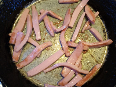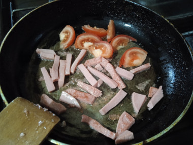 Сковороду для жарки разогрейте до горячего состояния и выложите нарезанную колбасу. Поджарьте её немного. Затем добавьте в сковороду нарезанные помидоры. Обжарьте их вместе с колбасой в течение минуты. За это время они станут мягче.