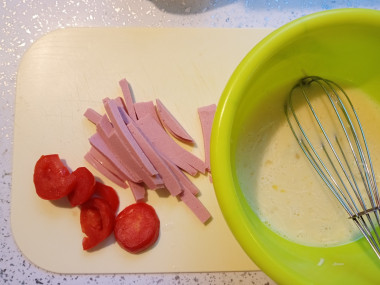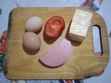 Как сделать омлет с колбасой и сыром на сковороде? Подготовьте для этого необходимые ингредиенты. Для омлета можно использовать любую колбасу, но мне очень нравится вареная. Сыр берите любой, главное, чтобы его легко можно было натереть на терке. Помидоры могут быть крупные или маленькие черри.