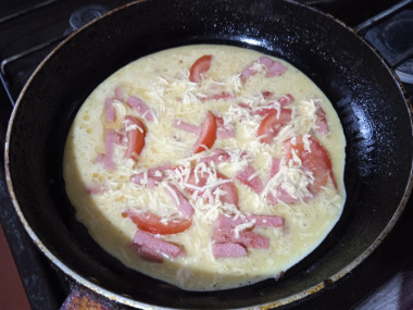 Колбасу с помидорами залейте яичной смесью. Накройте сковороду крышкой и готовьте омлет на небольшом огне около 8-10 минут. Не делайте большой огонь. Омлет подгорит, но не успеет пропечься сверху.
