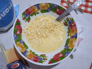В чашу к яйцам добавьте сыр, натертый на терке. Вмешайте его в яичную массу.