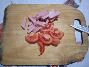 Помидорки помойте, удалите плодоножку и нарежьте кружочками или кубиками. Вареную колбасы нарежьте брусочками.