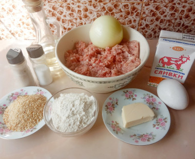 Калорийность продуктов: Фарш мясной, Куриные яйца, Лук репчатый, Растительное масло, Панировочные сухари, Соль, Перец черный молотый, Пшеничная мука, Сливочное масло, Сливки, Специи сухие
