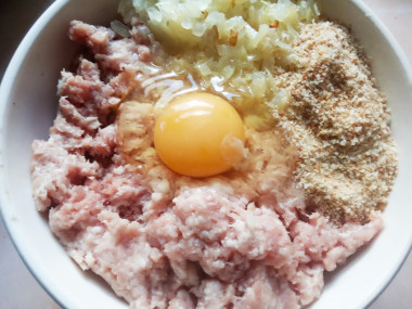 В миску положите фарш. Можно использовать готовый или накрутить его самостоятельно из любого мяса. Вкуснее, конечно, получится блюдо из смешанного мяса: свинины и говядины. В миску с фаршем добавьте обжаренный репчатый лук, вбейте куриное яйцо. Добавьте пару столовых ложек панировочных сухарей, соль и черный молотый перец по вкусу.