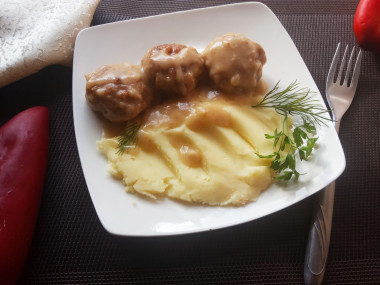 На второе решила приготовить фрикадельки в сливочном соусе. Очень вкусные фрикадельки получились! Добавление обжаренного лука в фарш придает им сочность и приятный вкус, а тушение в сливочном соусе делает фрикадельки очень нежными. На гарнир приготовила картофельное пюре. Просто, сытно, вкусно! Спасибо за рецепт, Snezhana!