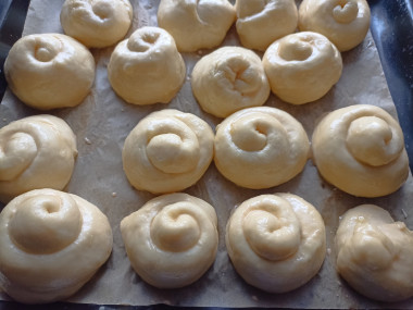 За это время булочки вырастут в размере. Смажьте их оставленным желтком, смешанным с молоком.