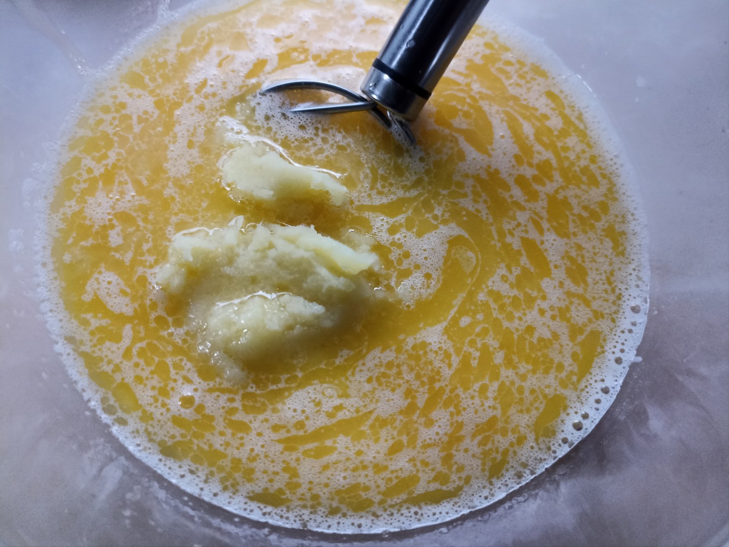 Влейте в миску теплое молоко, растопленное сливочное масло, растительное масло. Раскрошите (если у вас свежие) или всыпьте (если сухие) дрожжи. Добавьте размятый вареный картофель.