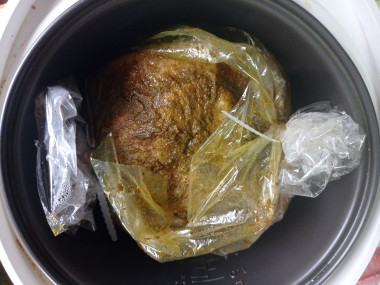 Промаринованное мясо укладываем в рукав для запекания. Краешки скрепляем специальными зажимами. Затем зубочисткой прокалываем пакет сверху в нескольких местах, чтобы пар выходил и не сильно "надувал" рукав. Укладываем мясо в чашу мультиварки. Включаем программу "выпечка". Я ставила программу на 1 час 30 минут. Ориентируйтесь по своим помощницам в зависимости от мощности мультиварки выбирайте время приготовления. Мощность моей 860 Вт.